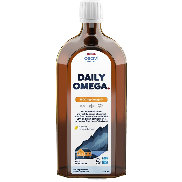 • Osavi Daily Omega, 1600mg Omega 3 (Natural Lemon) - 500 ml is a premium dietary supplement made from liquid fish oil, primarily derived from sustainably caught wild pelagic fish, such as anchovies. This product is specially formulated to deliver essential unsaturated fatty acids, notably DHA (docosahexaenoic acid) and EPA (eicosapentaenoic acid), in their naturally absorbable triglyceride form (TG).